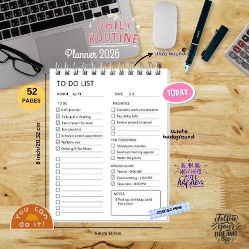 To do List, Notepad, daily, weekly monthly planner, perfect for enhanced productivity and goal achievement, 52 pages per pack, 100 gsm , size 6.5 x 9.8 inches. Floral Print .