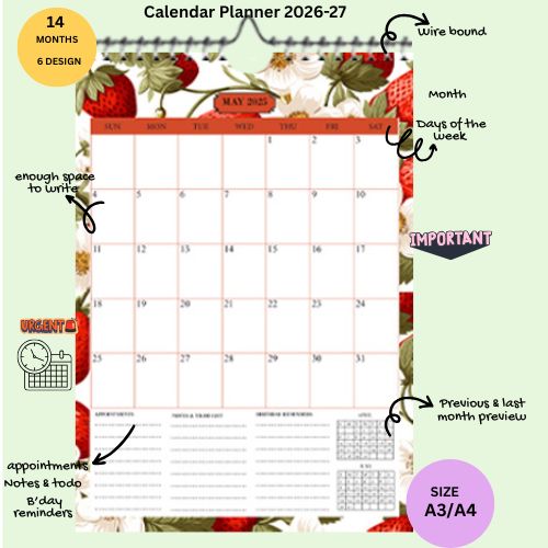 - Wall calendars measure 11.5 x 16.5 inches (A3 size- Portrait/A4)